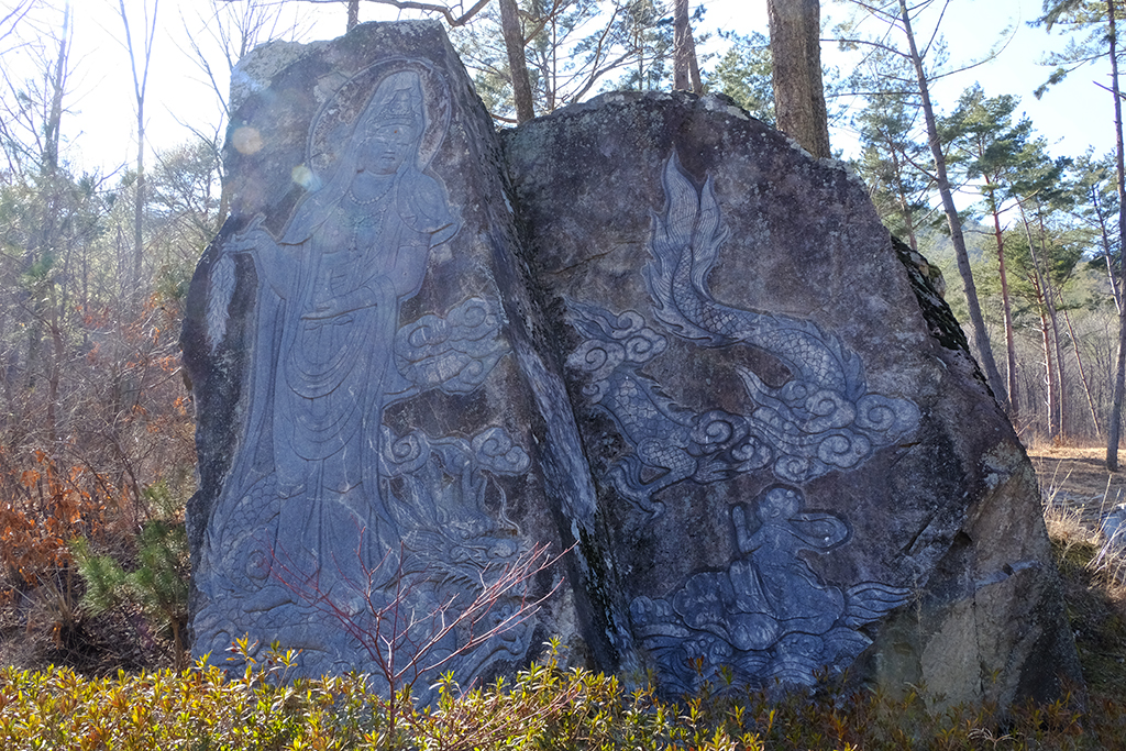 앞산의 영향으로 굴불사는 아직 응달이라면 홍주암은 양달이라서 햇볕이 가득했습니다.홍주암(紅珠庵)은 "붉은 구슬"을 의미하니 바로 해(태양)를 의미합니다.붉은 글씨로 바위에 새겨져있습니다.원효굴에서 수행하던 옛 스님이 새긴듯 하며 연대는 미상입니다.