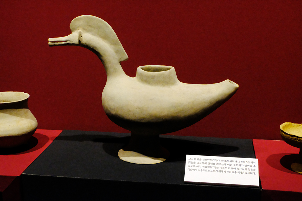오리를 닮은 새 모양토기로 삼국지 위지동이전의 "큰새의 깃털을 이용하여 장례를 치르는데 이는 죽은자가 날아갈 수 있도록 함기 위함이다"라고 합니다.죽은자를 위한 장송 의례용 토기입니다.
