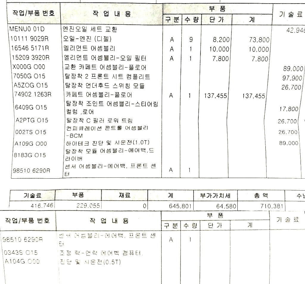 다행히 에어백 선서는 기존 무상수리기간에 포함시켜 비용에서 제외됨.