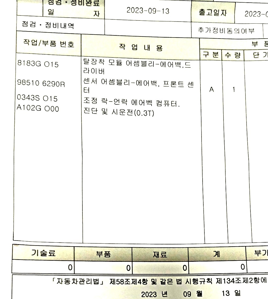 처음 입고 날짜인 2023.8.12일 기준으로 3년 무상수리 기간에 포함되어 추가 비용없이 에어백 센서 교체, 다음부터는 실 수리비용 지불해야함.
