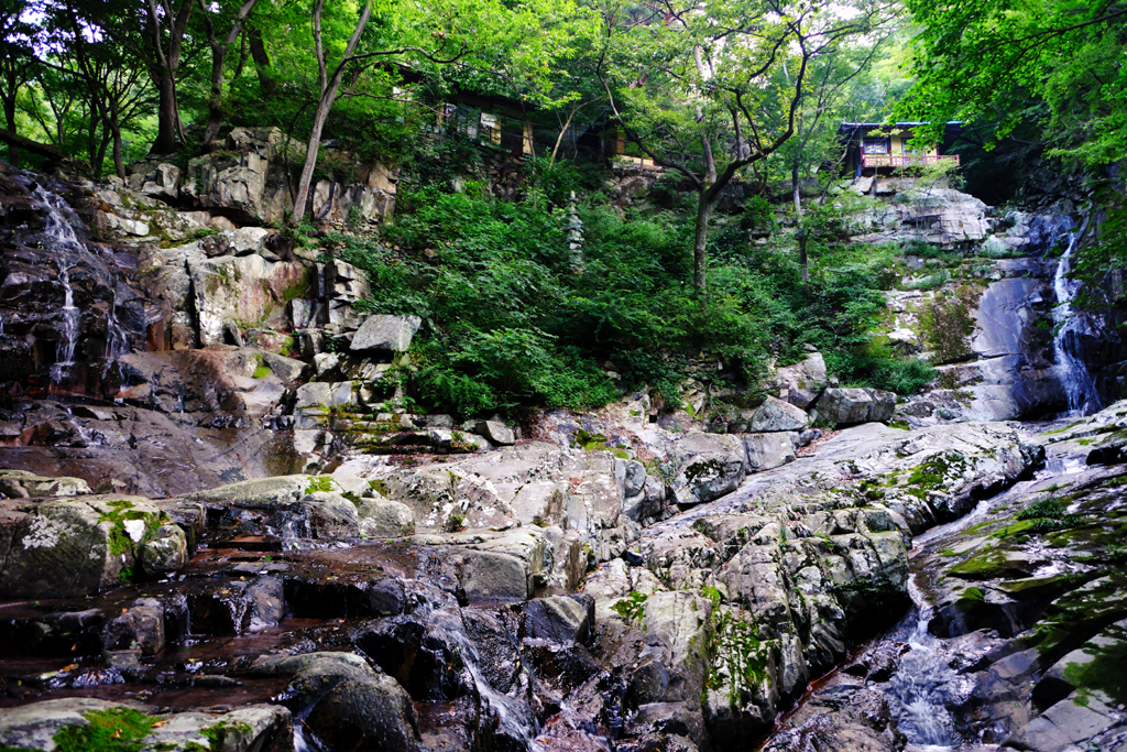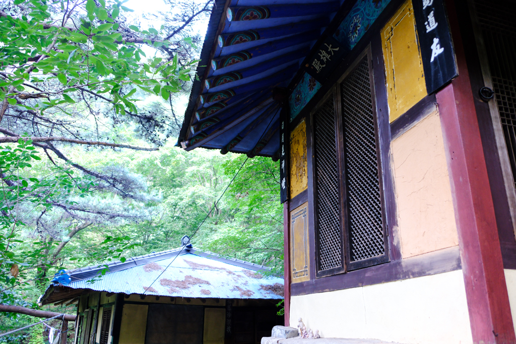 파스텔톤의 하늘색 슬레이트 지붕이 보이고 경내로 들어서면 그 좁은 곳에 작은 건물이 5채나 들어있습니다.나무를 보관하는 장소와 작은 화장실,요사채로 보이는 한계암,대웅전 및 수행공간으로 보이는 건물까지 바위 아래에 있습니다.세수대야가 있어서 세수를 하고보니 한계암은 한계(寒溪),즉 "찬 계곡"이라는 의미입니다. 대웅전을 중심으로 좌측의 위쪽은 은류폭포가 있고 우측 아래쪽엔 금강폭포가 협시보살처럼 있습니다.