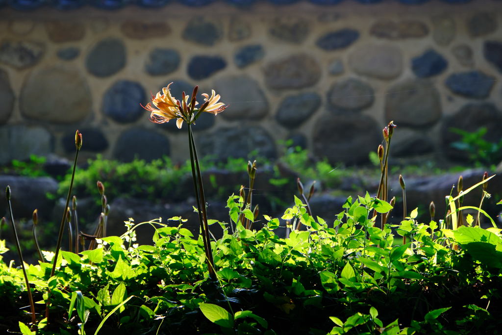 상사화가 돌 축대 아래 옹기종기 나열되어 심어져 분홍꽃이 피었고 배롱나무는 한창을 지났지만 여전히 붉은 빛을 내고 있었습니다.