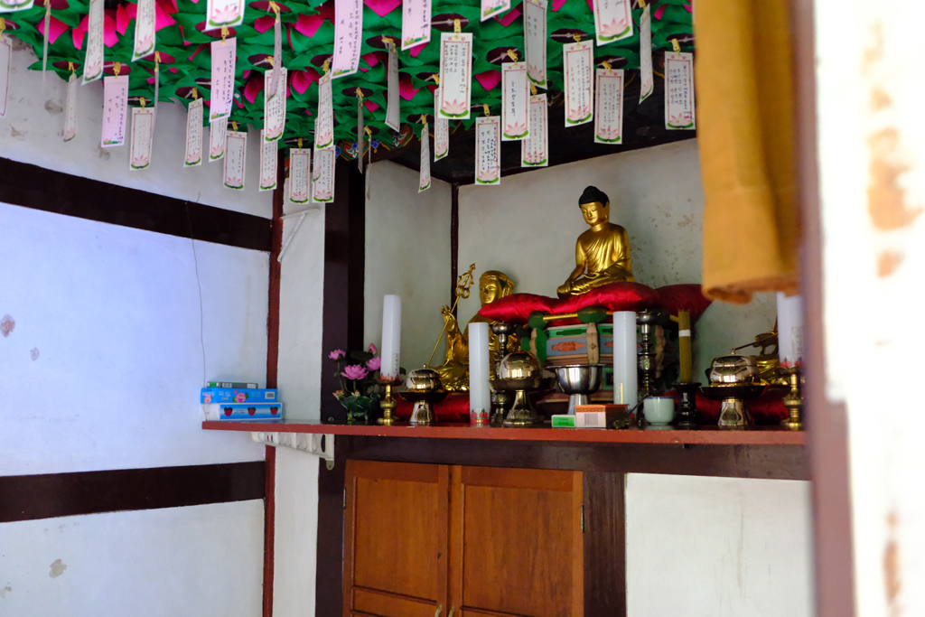 1평의 대웅전안에는 금강산 유점사에서 모셔왔다는 작은 불상이 있고 협시로 지장보살과 관음보살까지 있습니다.