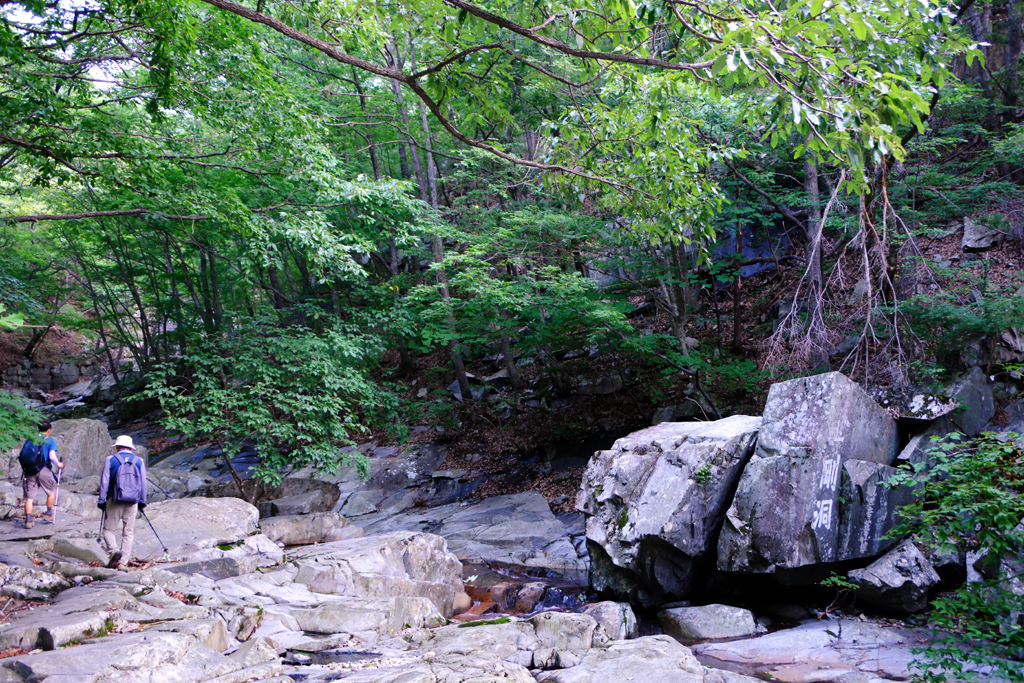 계곡을 우측에 두고 온갖 기암을 보며 오르다보니 땀이 나는 것을 알아차리지 못하고 힘든것도 잊게 되며 아침의 싱그러운 정기를 폐부 깊숙이 들이마시게 됩니다. 계곡의 거대한 바위에 '금강동(金剛洞)'이라는 글자가 흰 페인트로 적혀 있으니 여기가 금강동천이라는 의미입니다.우연히 동행하게된 산행을 오신 두분은 천황봉으로 향해가는데 한계암까지는 길이 같습니다.