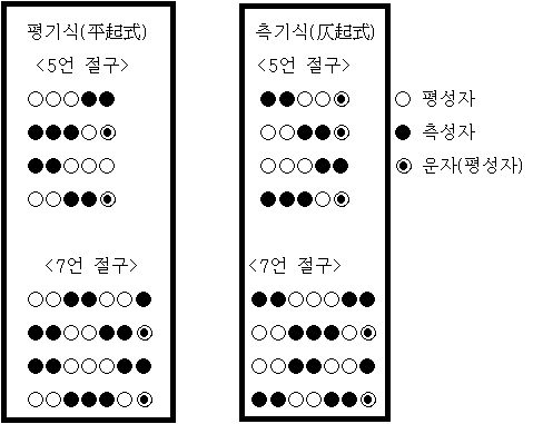 예를 들어, 평평측측평평측(平平仄仄平平仄)처럼 평성은 앞, 측성은 뒤에 오도록 배열합니다.