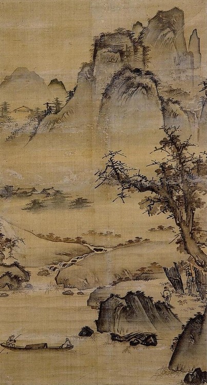 산수도는 근경의 큰 수목과 중경의 마을, 원경의 안개 낀 산을 통해 깊이감과 x자형 구도를 강조하며, 안견파 영향이 상대적으로 강합니다. 창윤한 묵기와 수지법으로 활달함을 보이지만, 고목 표현에서 강희맹의 독조도와 유사점을 공유합니다. 고려 전통 계승과 조선 초기 다양성을 보여주며, 후기 절파에 영향을 미칩니다.산 좌측엔 산사 같은 집이 한채 보이고 우측엔 폭포가 있습니다. 나룻배를 타고 강을 건너는 두 사람 중 뒤에 앉은 사공은 열심히 노를 젓고 있고, 앞에 앉은 사람은 아마도 벗을 찾아가는 선비로 보입니다.강 언덕 위에 있는 집의 사립문에는 손님을 맞으러 나와 있는 주인이 서 있고 사립문 앞에는 싸리비를 들고 짚앞을 쓸고 있는 시종의 모습이 보입니다.