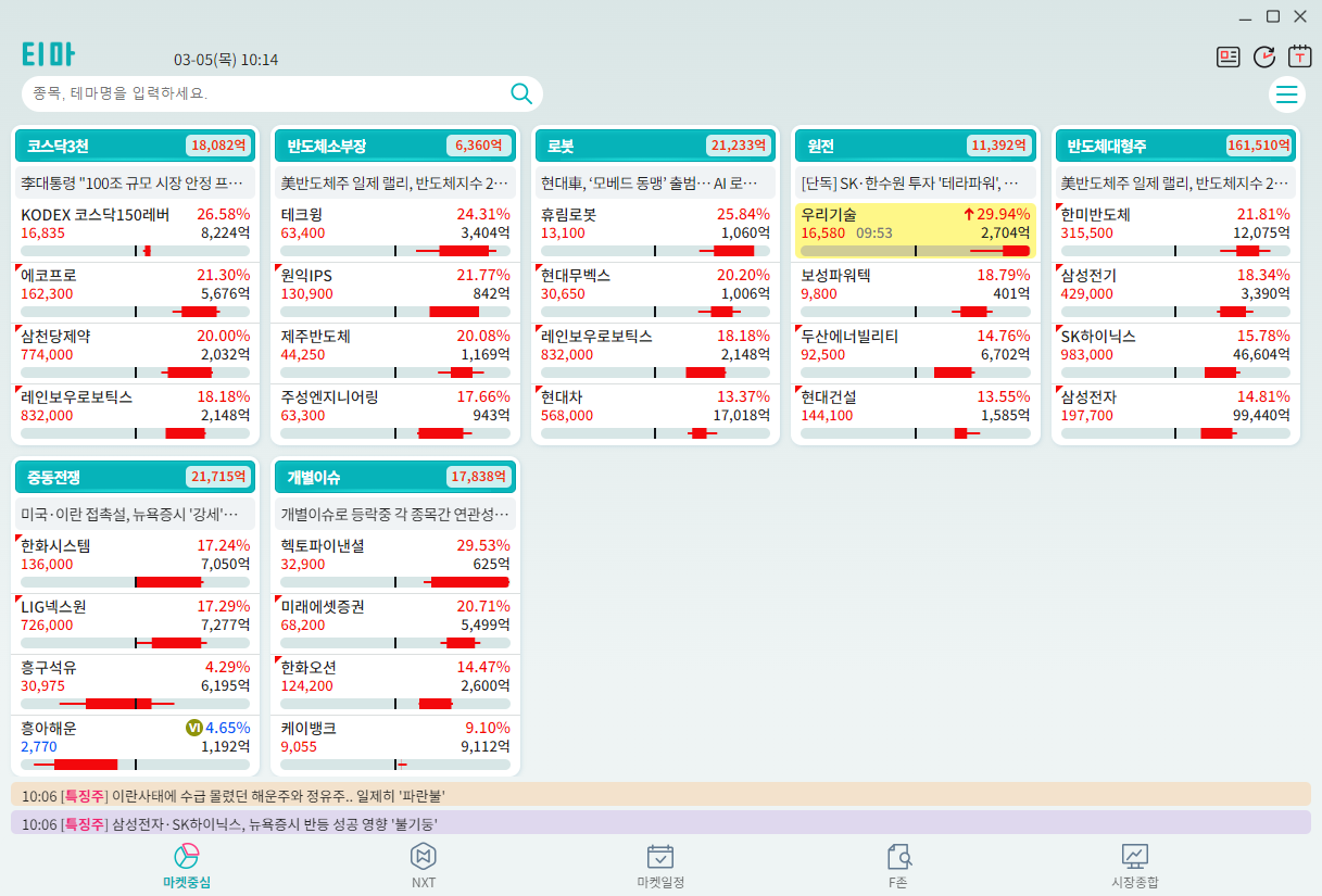- 테마주 대장주 파악은 9시 20분~11시 사이....테마주 갯수가 서너개되면 가장 힘이 있는 테마가 형성될때까지 관찰 필요