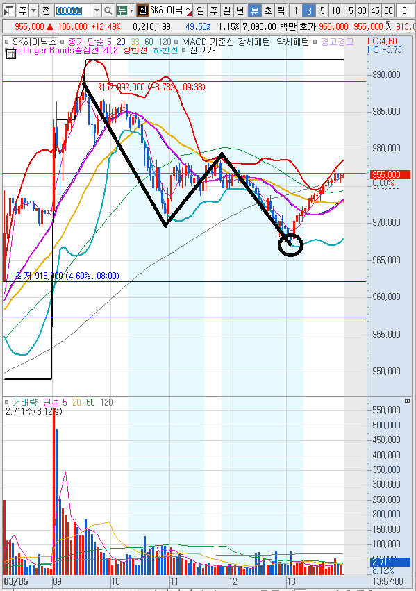 * 오후에 매매할때는 오전보다 거래가 많이되는 종목을 선택하고 5분봉 쌍바닥 확인이 되는 시점에서 공략