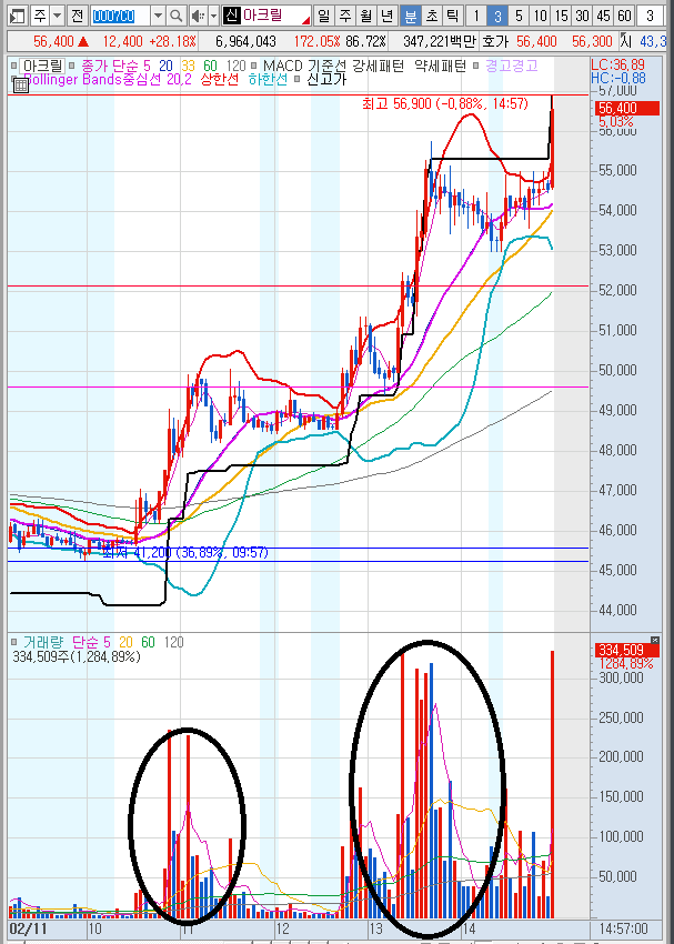 2.아크릴..오전보다는 오후에 더 많은 거래량....결국 상한가로 급등
