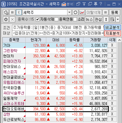 * 대장주는 0186년 첫화면 15종목 내에서 찾음.(주도테마주 중에서 4% 이상 상승 & 1051 장중 투자자별 순매수) & 0156조건검색 실시간 종목 중에서 테마주 선별)